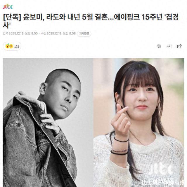 真是双喜临门啊! 据韩国媒体报道,韩国女子组合Apink成员兼演员尹普美(32岁)和作曲家黑眼必胜成员Rado(41岁)在历经9年恋爱长跑后,决定于明年步入婚姻殿堂。 演艺界相关人士透露,两人于近日确定了婚期,并逐步告知身边亲友。
